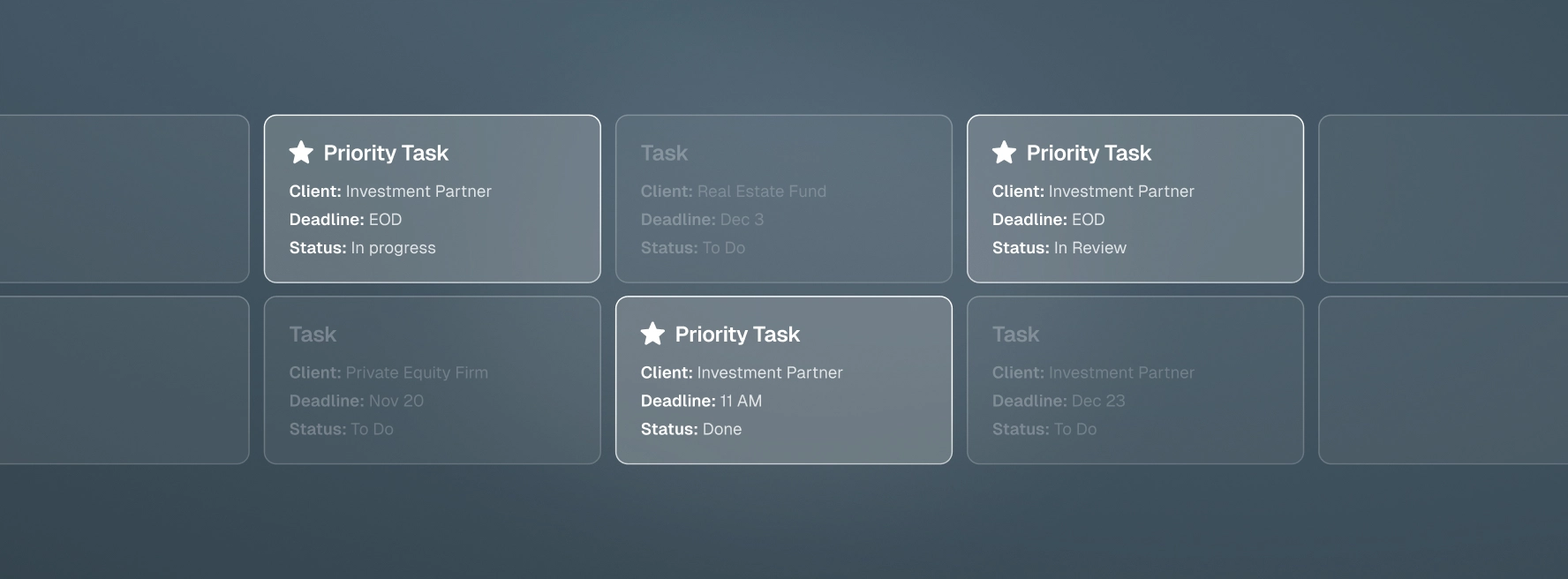 Current Priority Access clients include private equity, venture, and real estate firms. Some use us as a design and production backstop; others lean on us for ongoing content calendars, website optimization, or senior-level investor communications. In every case, the program provides flexibility, predictability, and confidence that support is available when needed.